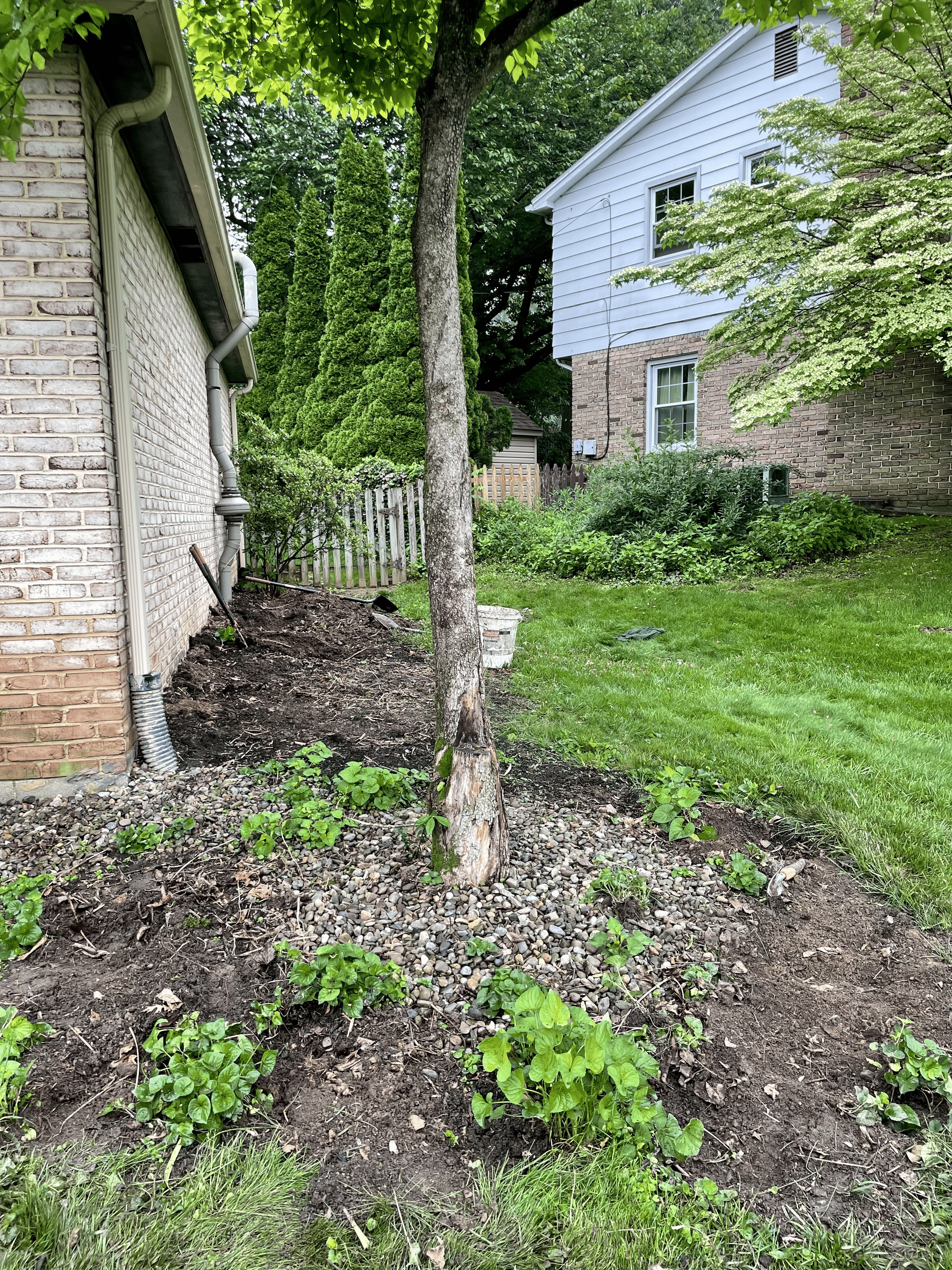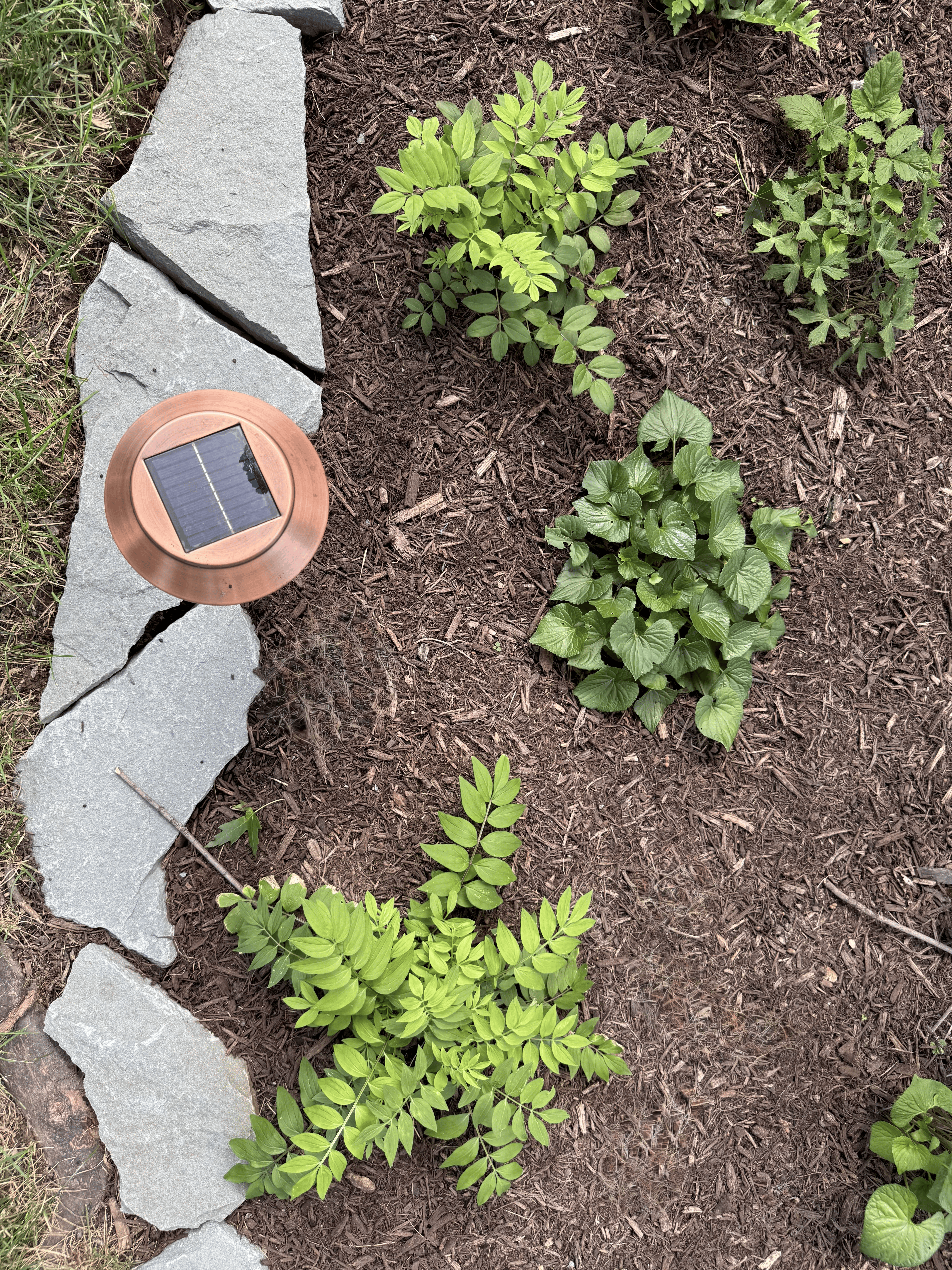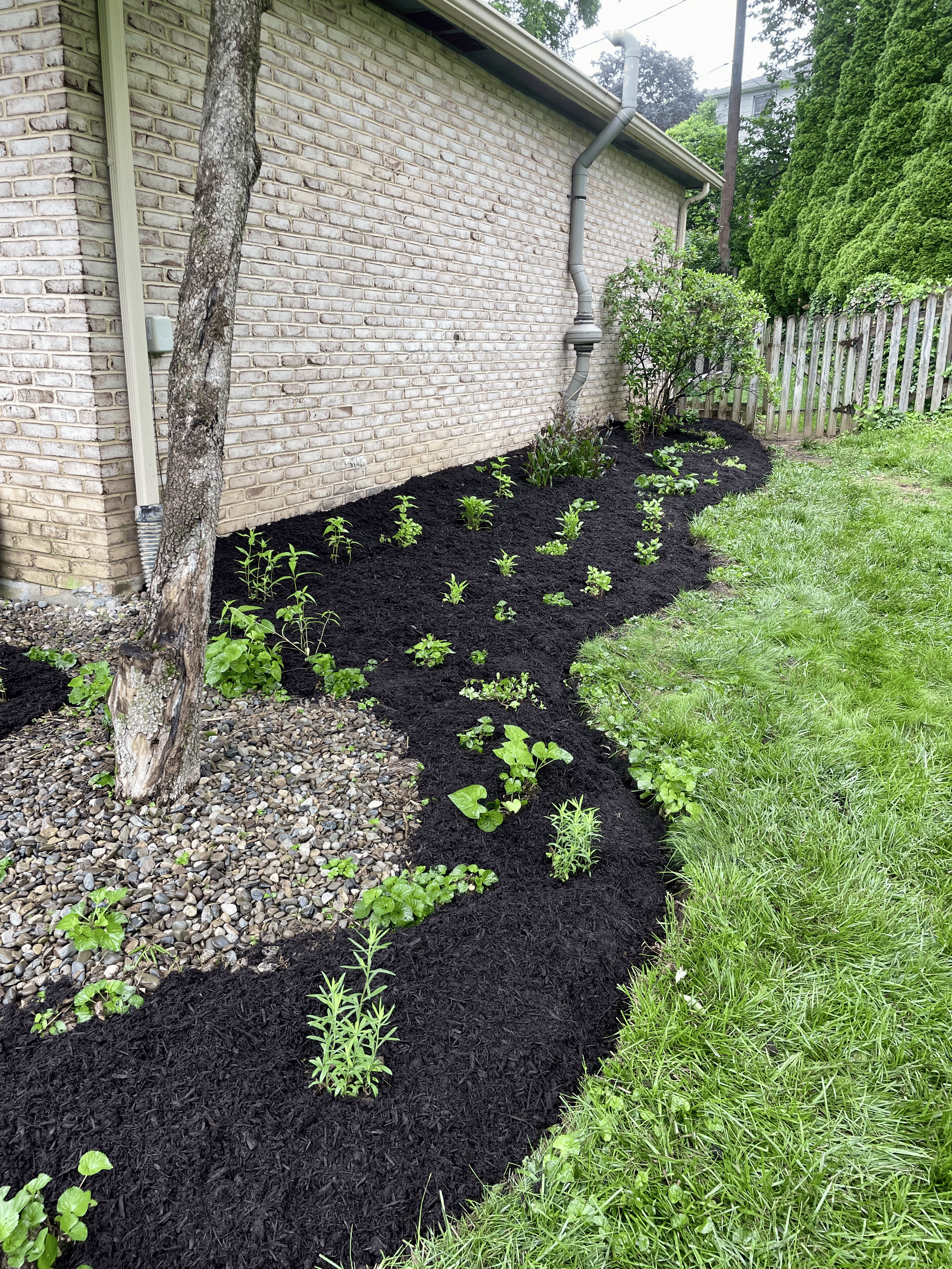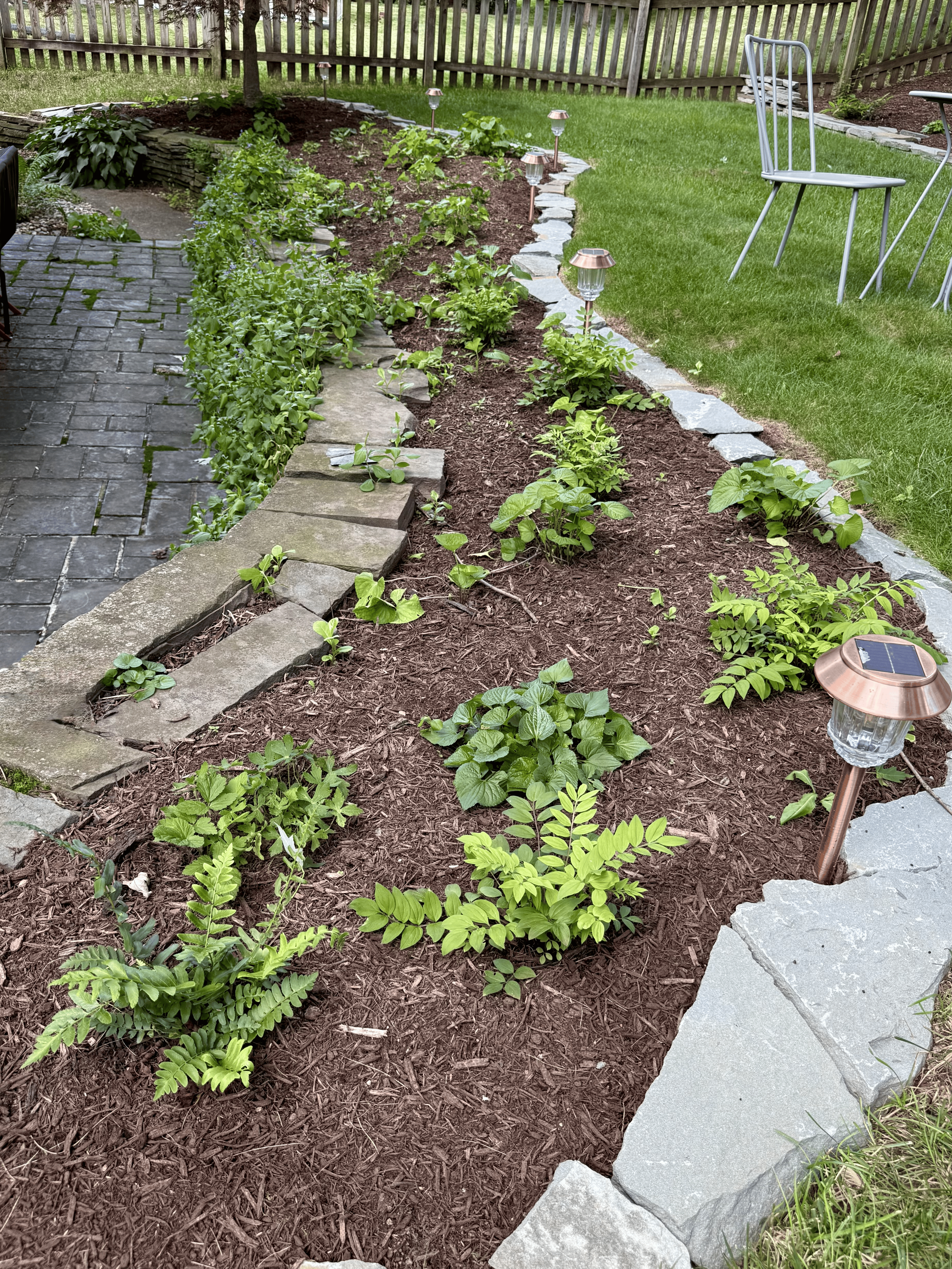 Another small garden in the backyard was updated with native plants and a stone border. This bed features six different species of shade-loving native plants!