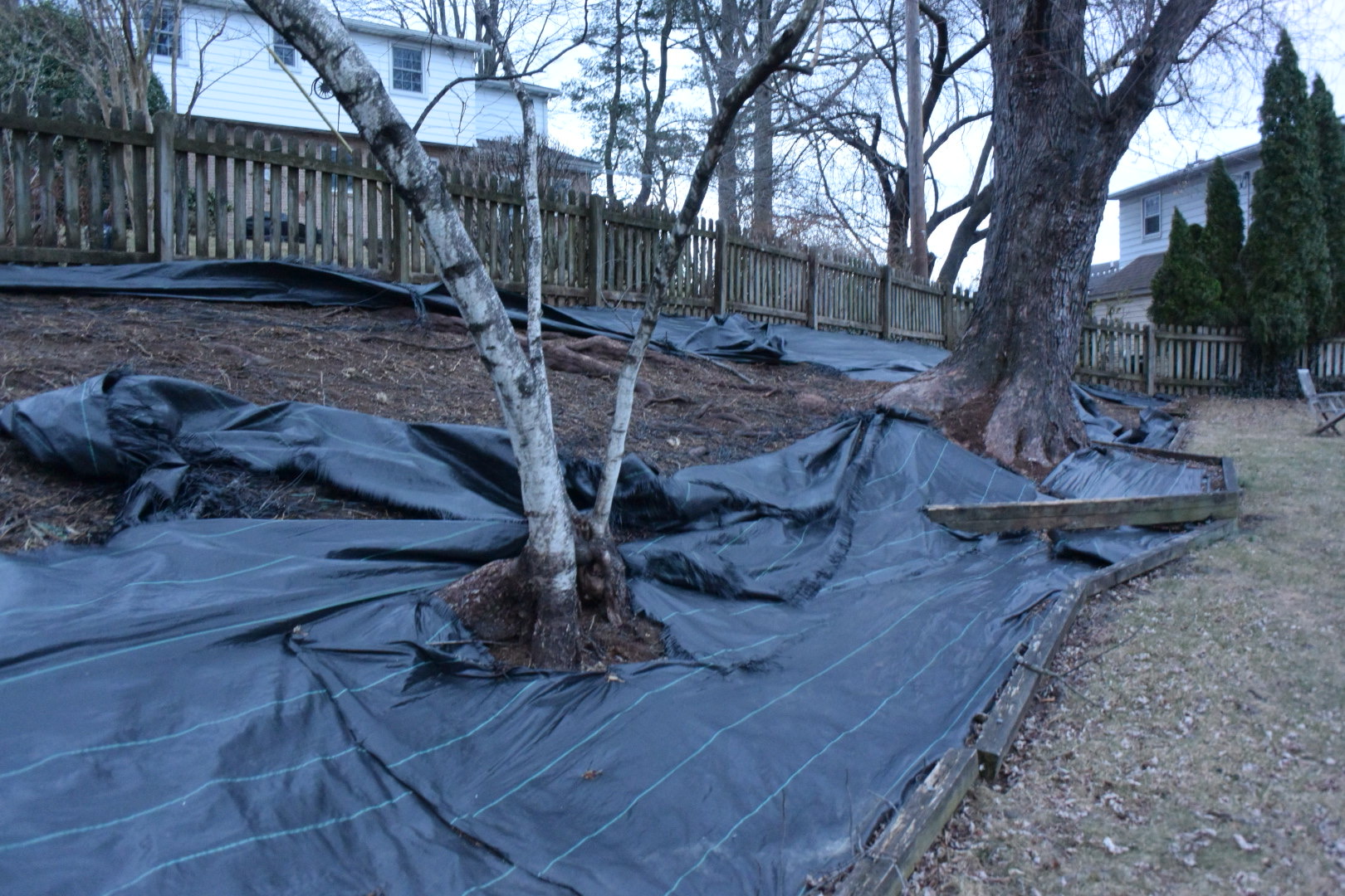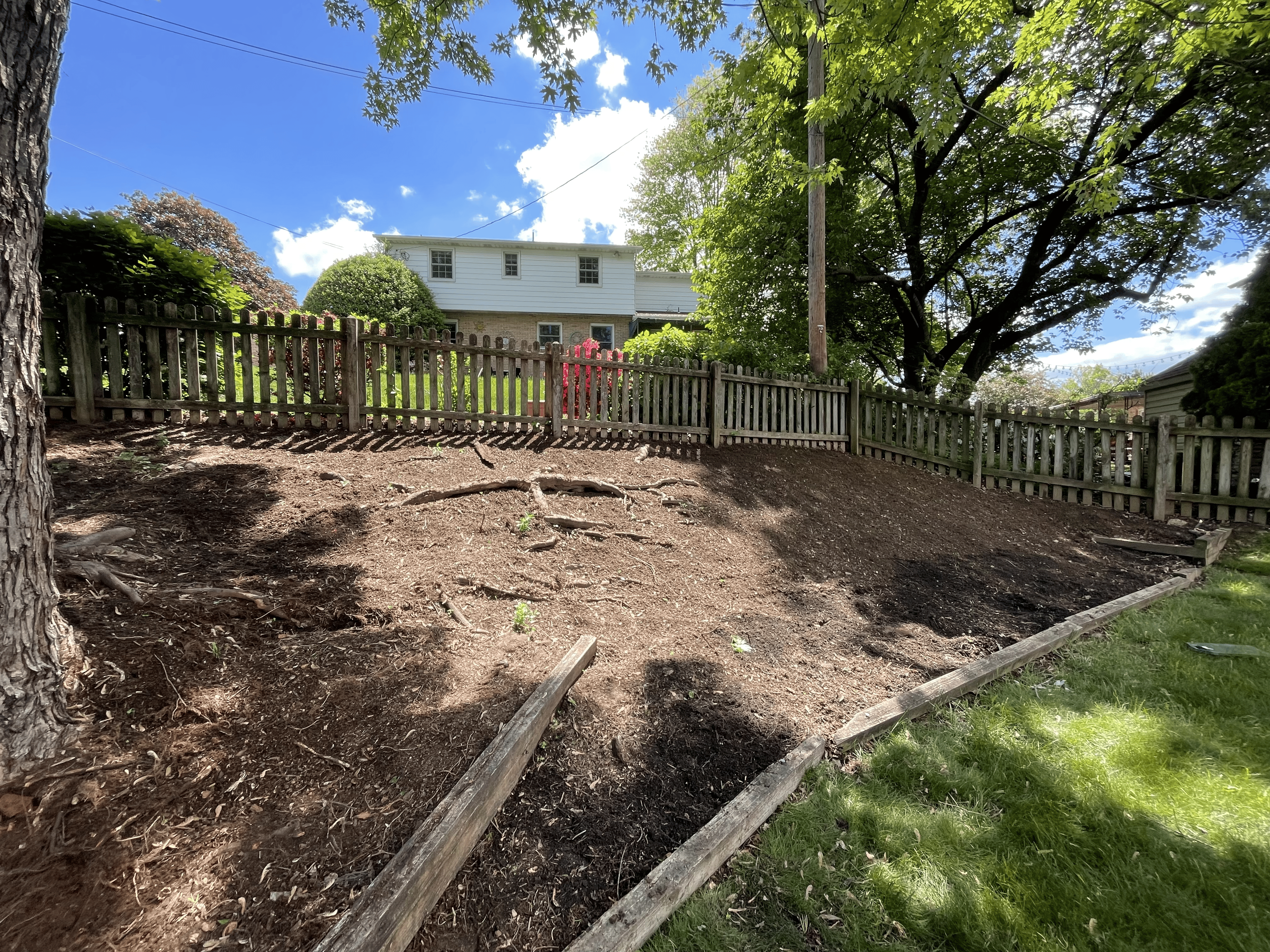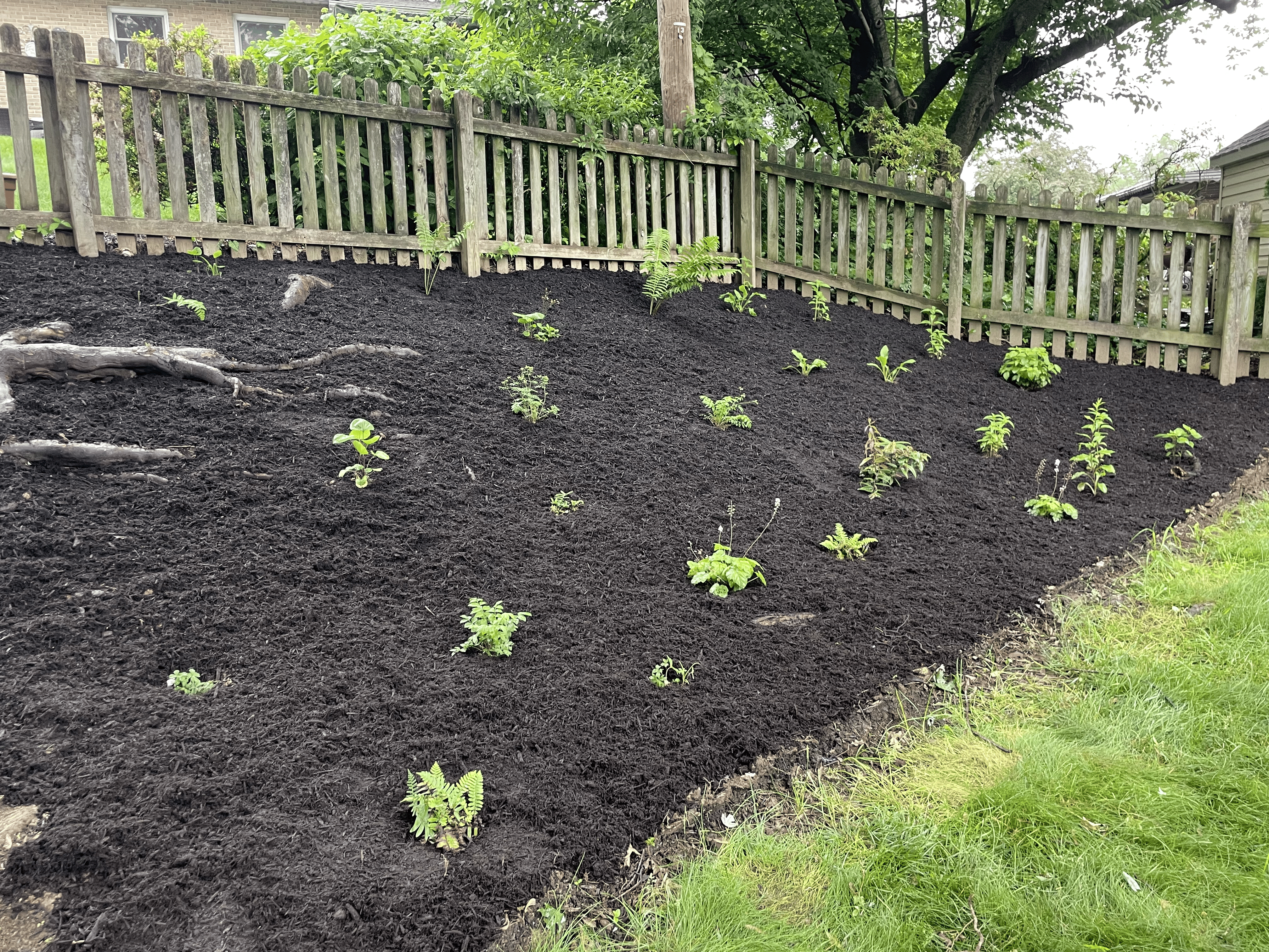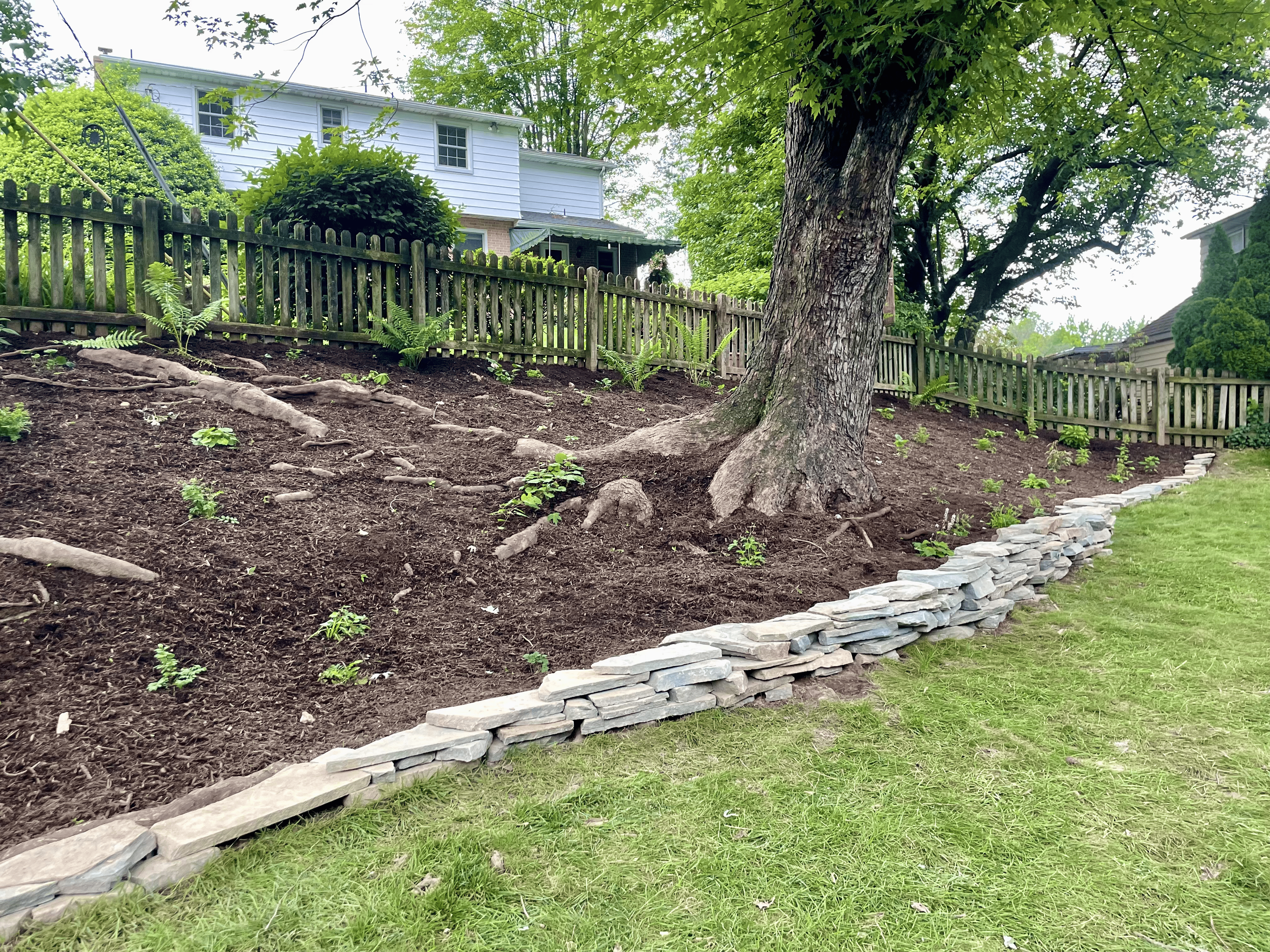 The backyard featured a large hillside garden bed. English Ivy, an invasive vine common in residential landscaping, had originally covered this hill. The ivy had been previously removed and a black tarp placed overtop the bed. Feather and Fern placed fifteen native plants on this hillside! What was an area covered in an invasive vine is now a diverse landscape! Additionally, the original border made with railroad ties was replaced with a carefully crafted wall made with colonial grey stacking stones.